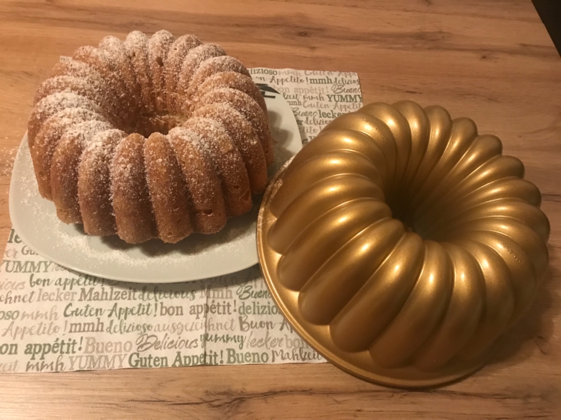 Butter mit Zucker und Eier schaumig schlagen.In der Zwischenzeit den Apfel in kleine Stücke schneiden und mit den restlichen Zutaten vermengen. In eine vorgefettete Gugelhupfform füllen und ca. 50 Minuten bei 180 Grad Ober- und Unterhitze backen.