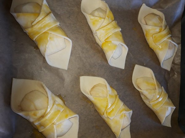 Den Teig in Quadrate schneiden und mit einem Esslöffel Marzipan-Puddingmasse belegen. 2 Apfelspalten auf die Masse legen und zu einem Tascherl formen. Aus den Teigresten ein kleines Stück auf die Öffnung vom Tascherl legen (siehe Foto). Die Apfelspalten mit Marmelade bestreichen und mit Mandelsplitter garnieren. Das Tascherl mit Eidotter bestreichen.