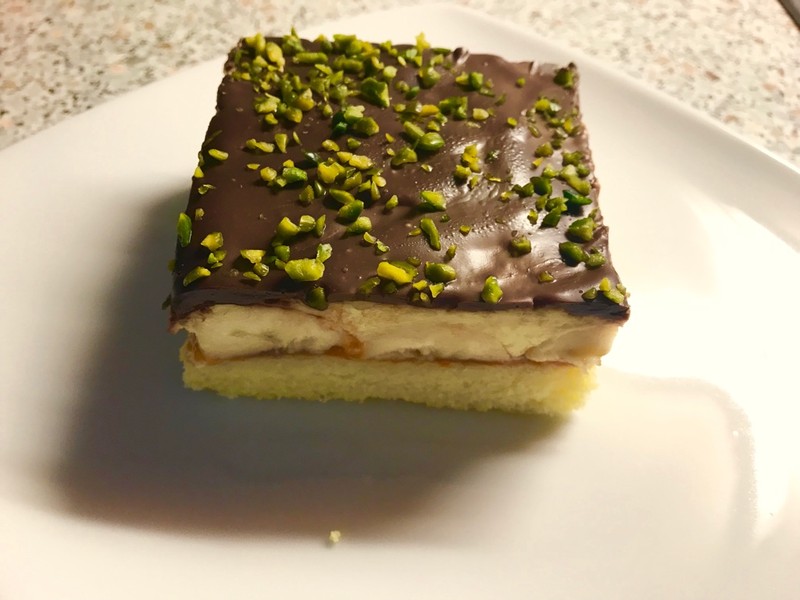 Anschließend Marillenmarmelade auf den Biskuit Boden streichen und mit Bananen belegen. Danach die Creme auf die Bananen streichen und für ca. 2 h kühlstellen.