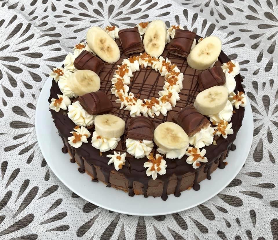 Den Nussbiskuit 1x durchschneiden und mit Marmelade bestreichen. Mit den Bananen belegen und die Buenocreme darauf verteilen.
