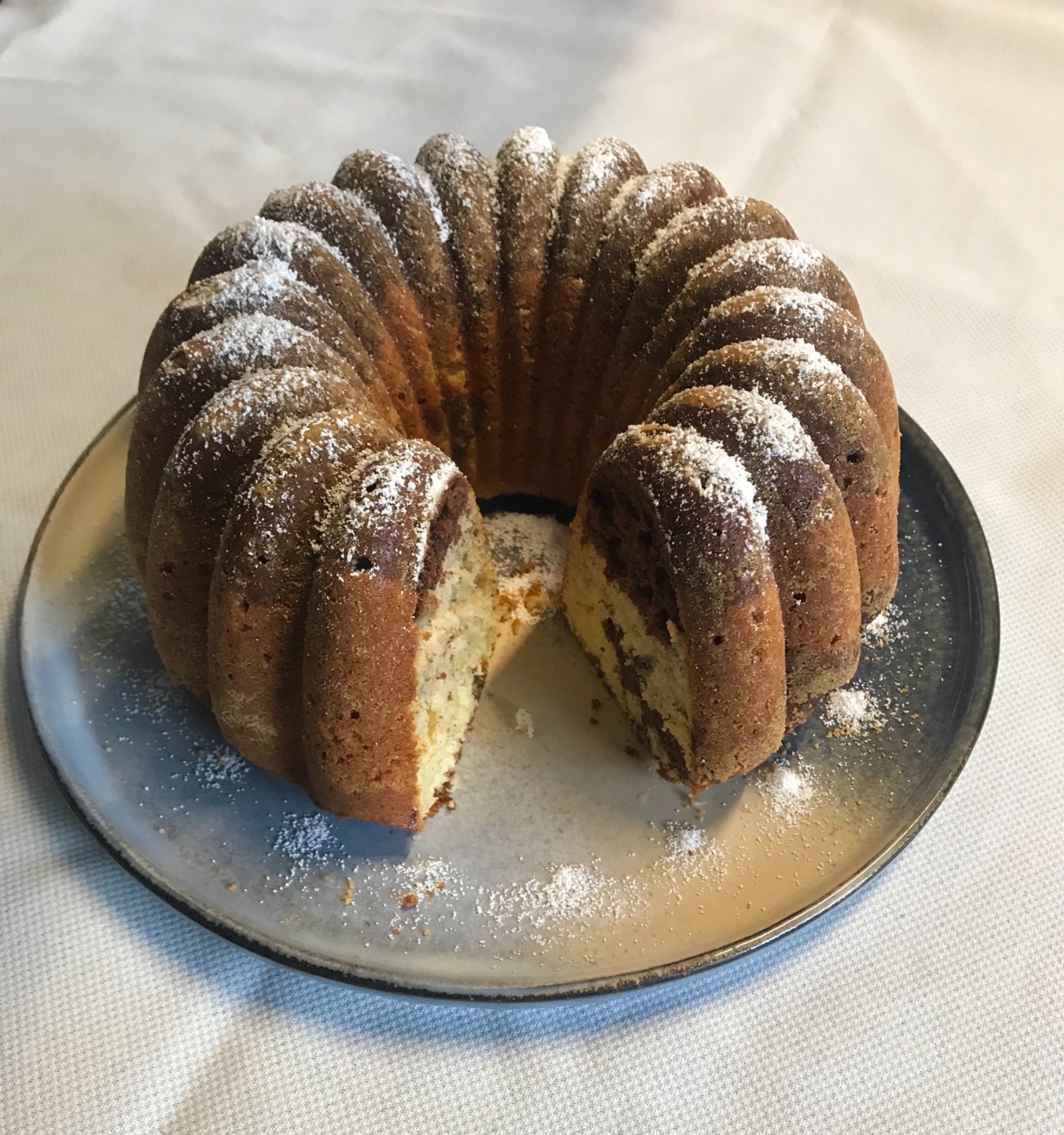 Einen Teil mit geriebenen Nüssen und den anderen Teil mit Backkakao verfeinern.Abwechselnt in die Gugelhupfform füllen und bei 180 Grad Ober- und Unterhitze ca. 45-50 Minuten backen.