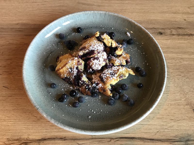 Beim Backen ca. 2 Schöpflöffel Teig in eine Pfanne geben und mit Heidelbeer bestreuen. Bei niedriger Hitze goldbraun backen.