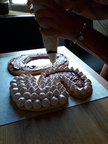 Biskuit Boden 2x zubereiten und auskühlen lassen. Die gewünschte Nummer/Form ausschneiden. Mit Marmelade bestreichen.