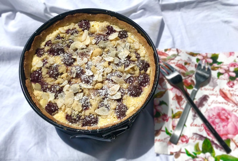 Die Masse in die Auflaufform füllen und mit Kirschen belegen.