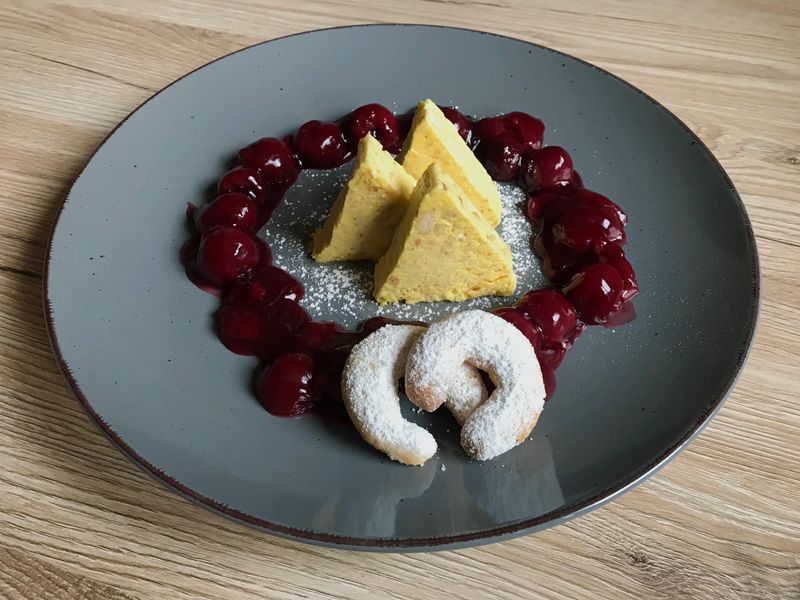 Vanillekipferlparfait mit Weichselragout