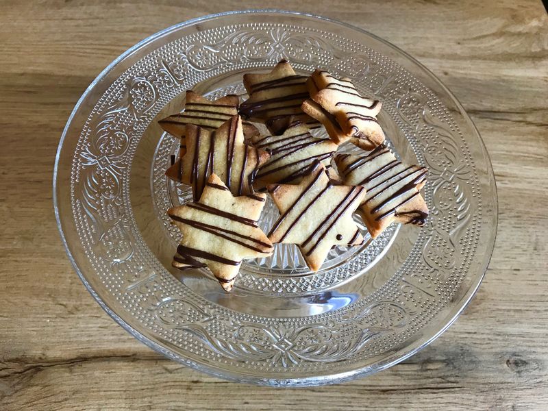 Mit Nutella oder Marmelade zusammenkleben und mit Schokofäden sowie Goldstaub verzieren.