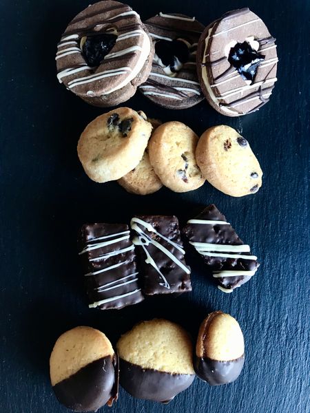 Die Trockenen Zutaten vermischen und in eine Rührschüssel sieben. Die übrigen Zutaten dazugeben und mit dem Knethaken zu einem Teig verkneten. Schoko Tröpfchen kurz unterkneten. Den Teig auf einer leicht bemehlten Arbeitsfläche zu ca. 4-5 cm dicken Rollen formen und in Frischhaltefolie gewickelt 1 Stunde kalt stellen.